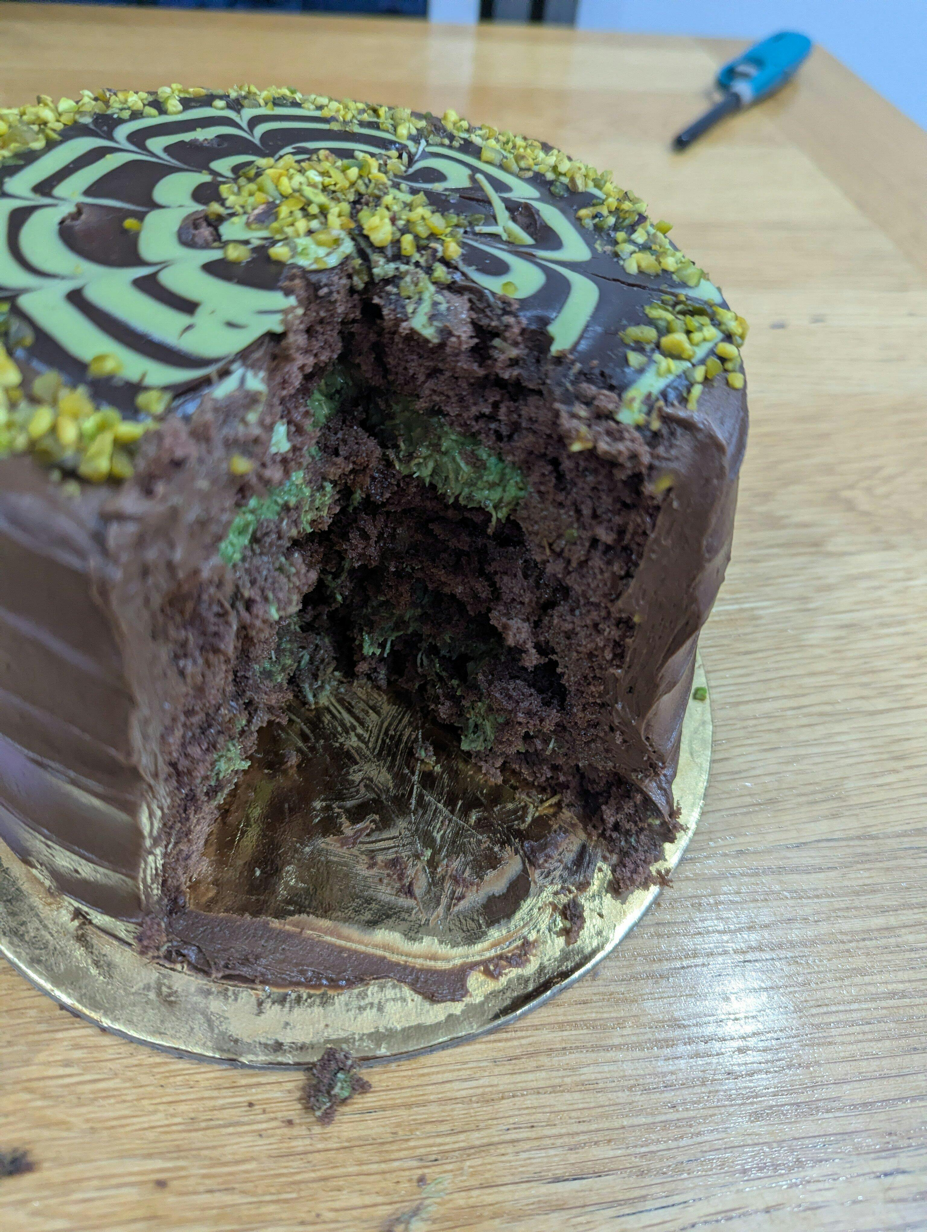 Bought this for my daughter's birthday and it's really moist and chocolatey. The green part is really crunchy and so tasty. Love it. Will definitely buy again.