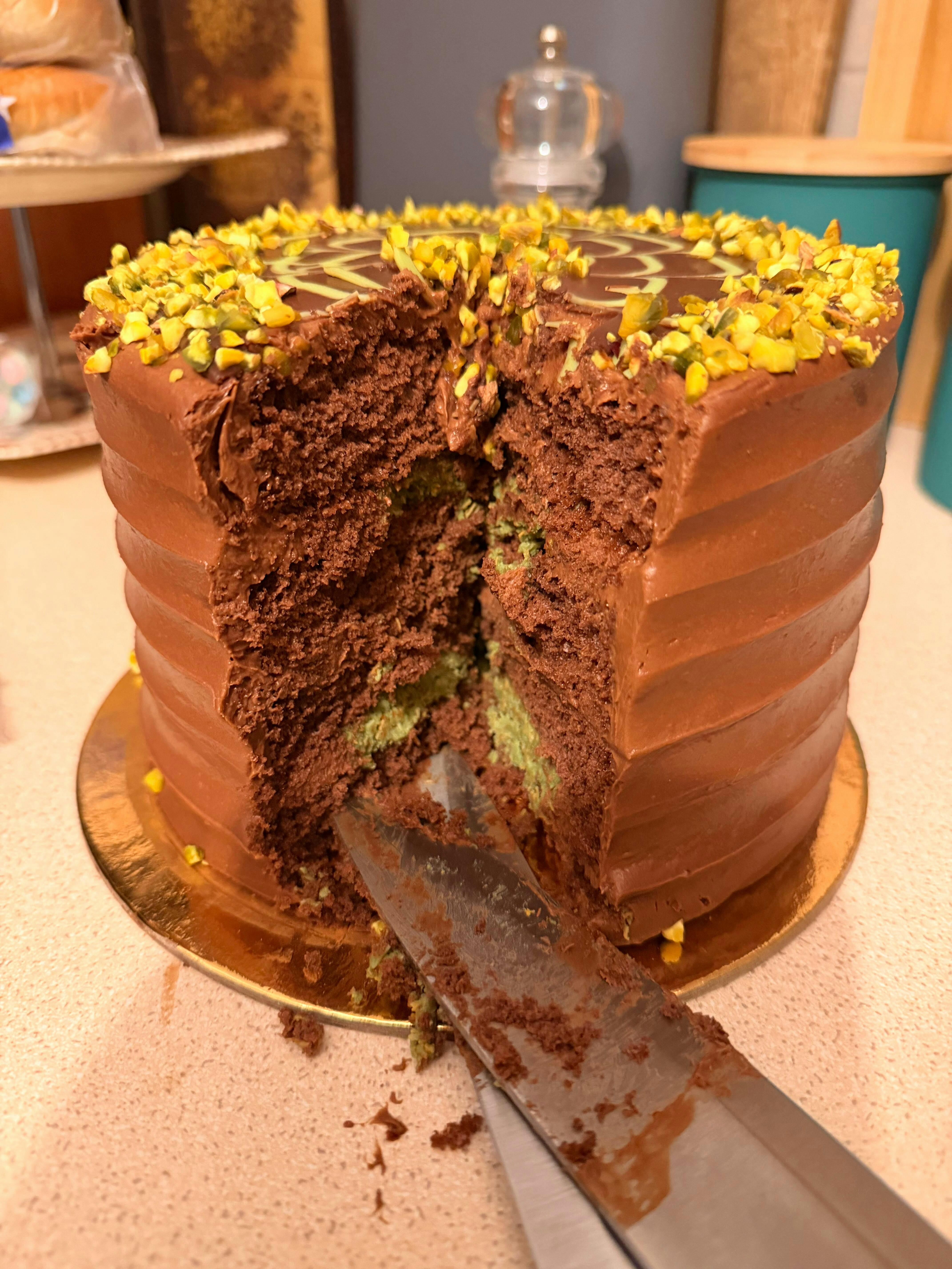 A gorgeous cake, with beautifully defined pink (raspberry) and green (pistachio) layers. Delicious! Ot was personalised for my daughter's 30th birthday with her name and message on a white chocolate disc and that along with a cake topper made it special for her special day! ❤️