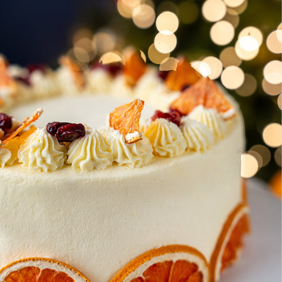 Introducing our Luxury Clementine & Cranberry Celebration Cake — a radiant showcase of Clementine sunshine and festive berry brilliance, lovingly handcrafted for those who adore a refreshing twist on tradition.