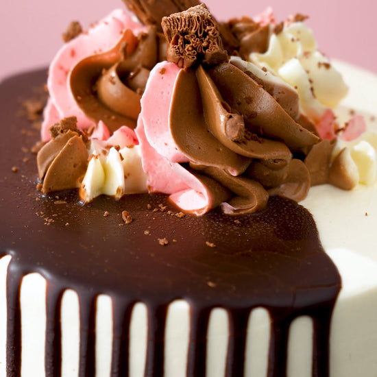 - Decorated to Impress – Coated with elegant stripes of chocolate buttercream and pink and white Swiss meringue buttercream. Finished with a decadent dark chocolate ganache drip, whippy-style buttercream swirls in chocolate, pink and white, two mini Flake pieces, and a scattering of flaked chocolate.