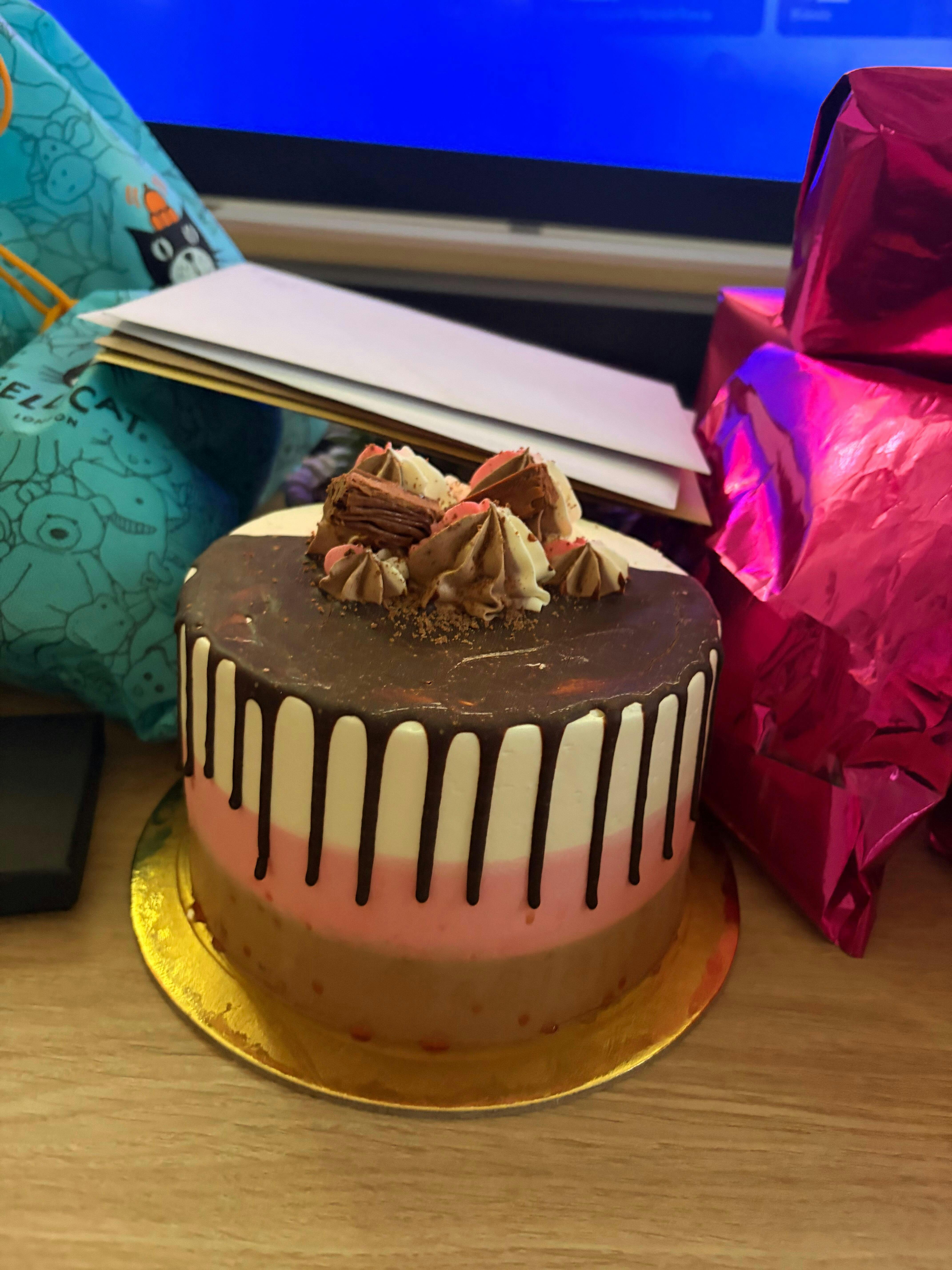 - Decorated to Impress – Coated with elegant stripes of chocolate buttercream and pink and white Swiss meringue buttercream. Finished with a decadent dark chocolate ganache drip, whippy-style buttercream swirls in chocolate, pink and white, two mini Flake pieces, and a scattering of flaked chocolate.