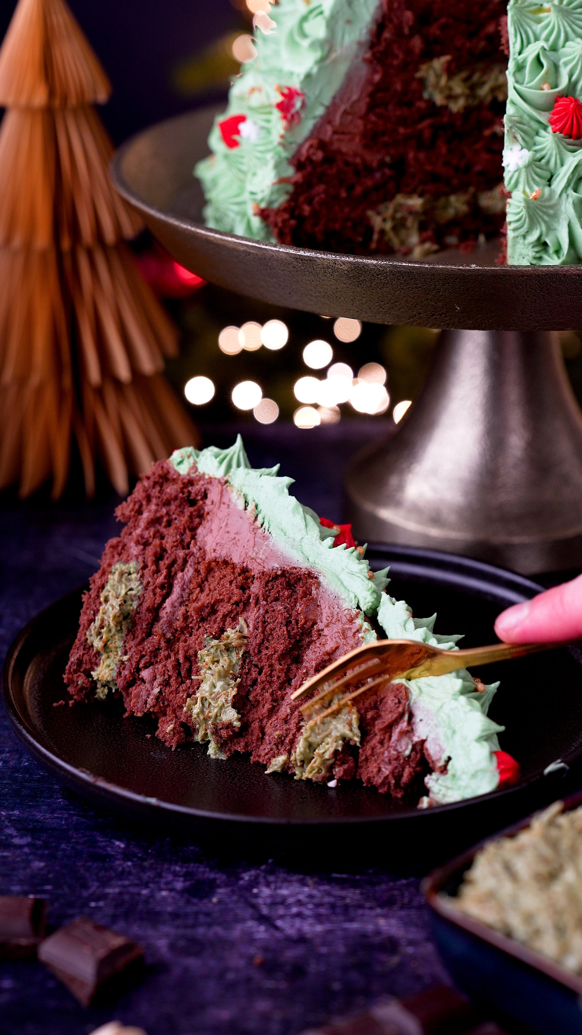 Chocolate Cream (Milk) (Creme Patisserie (Sugar, Modified Starch, Skimmed (Milk) Powder, Lactose (Milk) Proteins, Coconut Oil, Gelling Agent (Sodium Phosphates, Diphosphates, Sodium Alginate, Calcium Sulphate, Firming Agent: Calcium Sulphate (Flavouring, (Contains Milk) Colour (Carotenes), Water, Dark Couverture Chocolate (Cocoa Mass, Sugar, Cocoa Butter, Emulsifier (Soya) Lecithin, Vanilla Extract), Whipped Cream (Whipping Cream (Milk), Cream Stabiliser (Sugar, Modified Maize Starch, Stabilisers (E450, E401), Chocolate Sponge Mix (Sugar, Wheat Flour (with Calcium , Iron, Niacin, Thiamin), Dried Whole Egg, Wheat Starch, Fat Reduced Cocoa Powder, Raising Agents, (E575), E501 (ii), E450 (i), Emulsifiers, (E475), (E472b), (E471), (E481), (E472e), Chocolate (Sugar, Cocoa Mass, Fat Reduced Cocoa Powder), Dried Egg White, Skimmed Milk Powder), Water, Rapeseed Oil (Rapeseed Oil, Anti Foaming Agent (E900), Release Agent E40 (Water, Vegetable Oil, Emulsifier (E476), Thickener (E903)), Pistachio (Nuts) Green Buttercream (Plain Swiss Buttercream (Sugar, Butter (Milk), Free Range Pasteurised Egg White, Margarine (Vegetable And Hydrogenated Vegetable Oil), Water, Salt, Emulsifier (E475), Flavourings, Colours (E160b, E100), Vanilla Mauritius (Flavouring (Water, (E1520), Caramel Sugar Syrup, Thickener (E415), Acidity Regulator (Citric Acid), Preservative (E202), (E442)), Pistachio (Nuts) Filling (Vegetable Fat (Palm, Sunflower), Sugar, Lactose (Milk), Nuts (Pistachios) (18%), Modified Starch, Skimmed Milk Powder, Emulsifier Soya Lecithin, Flavours, Antioxidant: Rosemary Extract)), Green Colour (Glycerol: E422; Canola Oil; Colours: E129; Emulsifiers: E322, E433)), Pistachio (Nuts) Kunafa Filling (Pistachio (Nuts) (18%), Modified Starch, Skimmed Milk Powder, Emulsifier Soya Lecithin, Flavours, Antioxidant: Rosemary Extract), Kunafa (Wheat Flour, Water, Salt), Pistachio (Nuts) Compound (Glucose Fructose Syrup, Sugar, Pistachio (Nuts), Water, Colouring Foods (Stinging Nettle Concentrate, Spinach Concentrate), Natural Flavouring), Fine Sea Salt (Salt, Anti Caking Agent: Sodium Ferrocyanide), Green Colour (E422, Canola Oil; Colours: E129; Emulsifiers: E322, E433)), Red Buttercream (Plain Swiss Buttercream (Sugar, Butter (Milk), Free Range Pasteurised Egg White, Margarine (Vegetable And Hydrogenated Vegetable Oil), Water, Salt, Emulsifier (E475), Flavourings, Colours (E160b, E100), Vanilla Mauritius (Flavouring (Water, (E1520), Caramel Sugar Syrup, Thickener (E415), Acidity Regulator (Citric Acid), Preservative (E202), (E442)), Red Colour (E422; Canola Oil; Colours: E102, E133; Emulsifiers: E322, E433), Golden Crunch Sprinkles (Sugar, Rice Flour, Colour (E172 (Iron Oxides), E100 (Circumin)), Glazing Agent (E414 (Gum Arabic)), Snowflake Sprinkles (Sugar, Sunflower Oil, Potato Starch, Rice Flour, Flavour (Natural Vanilla Flavouring)), Chocolate Star (Cocoa Mass, Sugar, Cocoa Butter, Vegetable Fat: Palm (SG), Emulsifier E476, E322 Soya, Natural Vanilla Flavour, Colour E172)).
