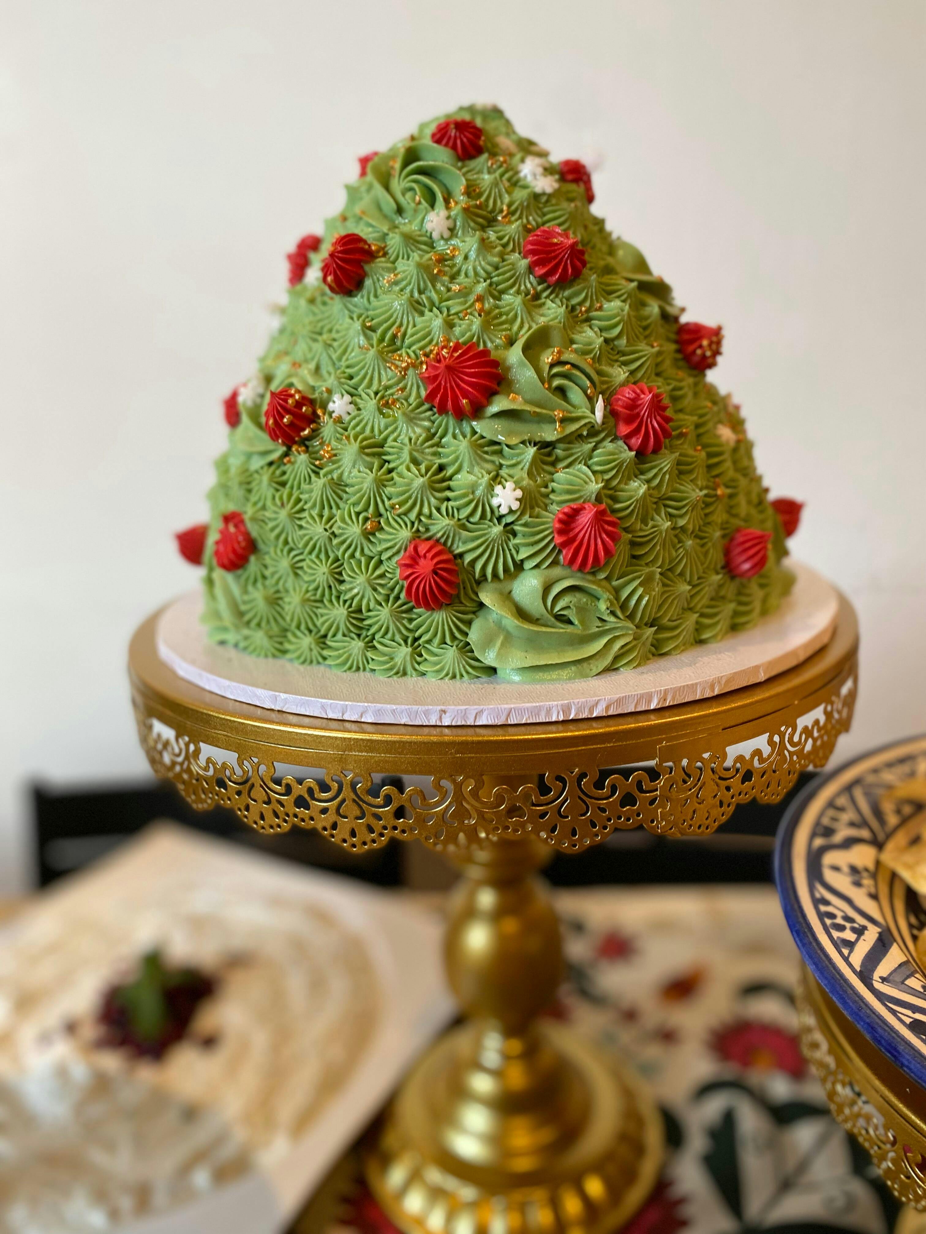 Chocolate Cream (Milk) (Creme Patisserie (Sugar, Modified Starch, Skimmed (Milk) Powder, Lactose (Milk) Proteins, Coconut Oil, Gelling Agent (Sodium Phosphates, Diphosphates, Sodium Alginate, Calcium Sulphate, Firming Agent: Calcium Sulphate (Flavouring, (Contains Milk) Colour (Carotenes), Water, Dark Couverture Chocolate (Cocoa Mass, Sugar, Cocoa Butter, Emulsifier (Soya) Lecithin, Vanilla Extract), Whipped Cream (Whipping Cream (Milk), Cream Stabiliser (Sugar, Modified Maize Starch, Stabilisers (E450, E401), Chocolate Sponge Mix (Sugar, Wheat Flour (with Calcium , Iron, Niacin, Thiamin), Dried Whole Egg, Wheat Starch, Fat Reduced Cocoa Powder, Raising Agents, (E575), E501 (ii), E450 (i), Emulsifiers, (E475), (E472b), (E471), (E481), (E472e), Chocolate (Sugar, Cocoa Mass, Fat Reduced Cocoa Powder), Dried Egg White, Skimmed Milk Powder), Water, Rapeseed Oil (Rapeseed Oil, Anti Foaming Agent (E900), Release Agent E40 (Water, Vegetable Oil, Emulsifier (E476), Thickener (E903)), Pistachio (Nuts) Green Buttercream (Plain Swiss Buttercream (Sugar, Butter (Milk), Free Range Pasteurised Egg White, Margarine (Vegetable And Hydrogenated Vegetable Oil), Water, Salt, Emulsifier (E475), Flavourings, Colours (E160b, E100), Vanilla Mauritius (Flavouring (Water, (E1520), Caramel Sugar Syrup, Thickener (E415), Acidity Regulator (Citric Acid), Preservative (E202), (E442)), Pistachio (Nuts) Filling (Vegetable Fat (Palm, Sunflower), Sugar, Lactose (Milk), Nuts (Pistachios) (18%), Modified Starch, Skimmed Milk Powder, Emulsifier Soya Lecithin, Flavours, Antioxidant: Rosemary Extract)), Green Colour (Glycerol: E422; Canola Oil; Colours: E129; Emulsifiers: E322, E433)), Pistachio (Nuts) Kunafa Filling (Pistachio (Nuts) (18%), Modified Starch, Skimmed Milk Powder, Emulsifier Soya Lecithin, Flavours, Antioxidant: Rosemary Extract), Kunafa (Wheat Flour, Water, Salt), Pistachio (Nuts) Compound (Glucose Fructose Syrup, Sugar, Pistachio (Nuts), Water, Colouring Foods (Stinging Nettle Concentrate, Spinach Concentrate), Natural Flavouring), Fine Sea Salt (Salt, Anti Caking Agent: Sodium Ferrocyanide), Green Colour (E422, Canola Oil; Colours: E129; Emulsifiers: E322, E433)), Red Buttercream (Plain Swiss Buttercream (Sugar, Butter (Milk), Free Range Pasteurised Egg White, Margarine (Vegetable And Hydrogenated Vegetable Oil), Water, Salt, Emulsifier (E475), Flavourings, Colours (E160b, E100), Vanilla Mauritius (Flavouring (Water, (E1520), Caramel Sugar Syrup, Thickener (E415), Acidity Regulator (Citric Acid), Preservative (E202), (E442)), Red Colour (E422; Canola Oil; Colours: E102, E133; Emulsifiers: E322, E433), Golden Crunch Sprinkles (Sugar, Rice Flour, Colour (E172 (Iron Oxides), E100 (Circumin)), Glazing Agent (E414 (Gum Arabic)), Snowflake Sprinkles (Sugar, Sunflower Oil, Potato Starch, Rice Flour, Flavour (Natural Vanilla Flavouring)), Chocolate Star (Cocoa Mass, Sugar, Cocoa Butter, Vegetable Fat: Palm (SG), Emulsifier E476, E322 Soya, Natural Vanilla Flavour, Colour E172)).