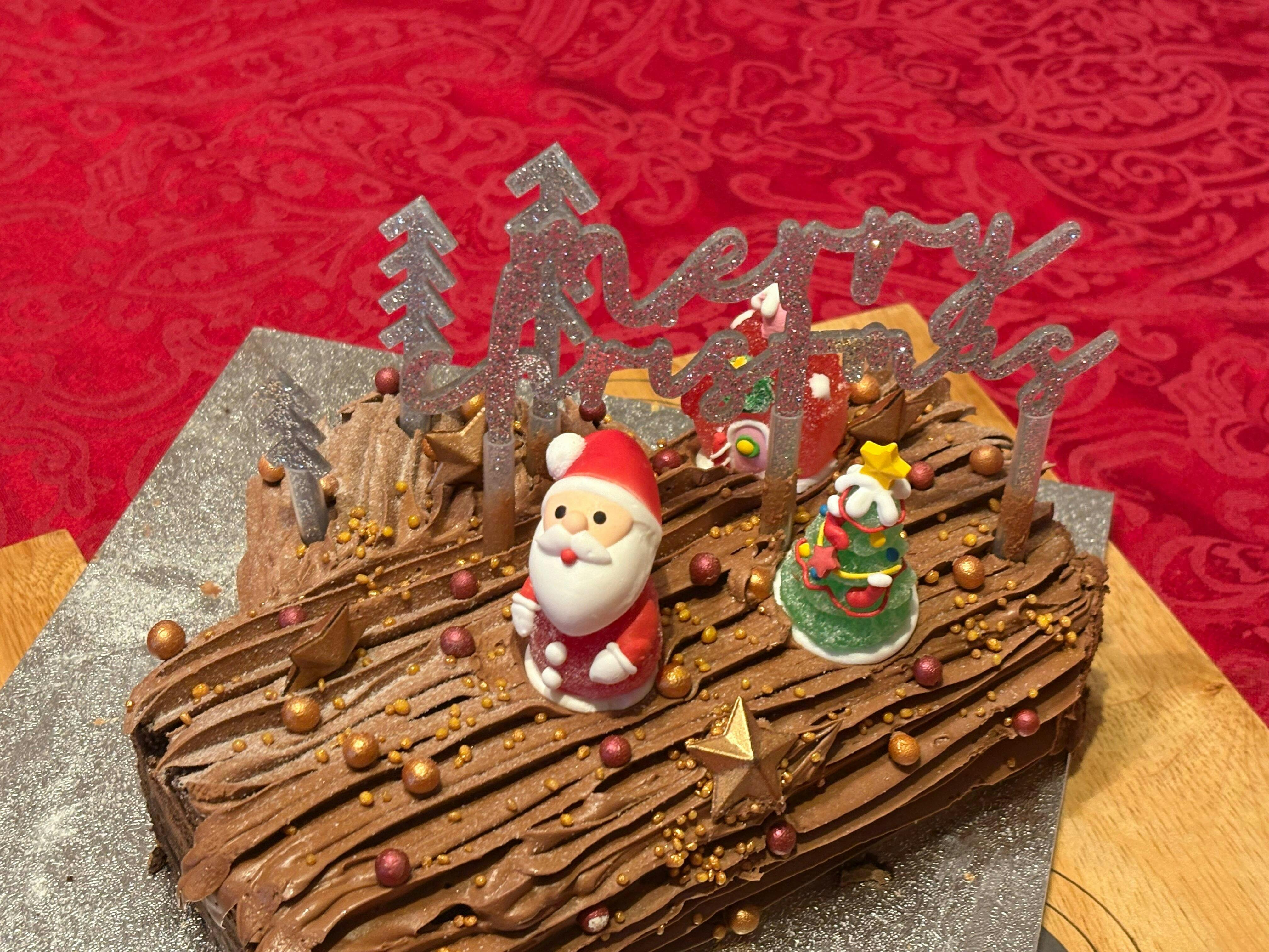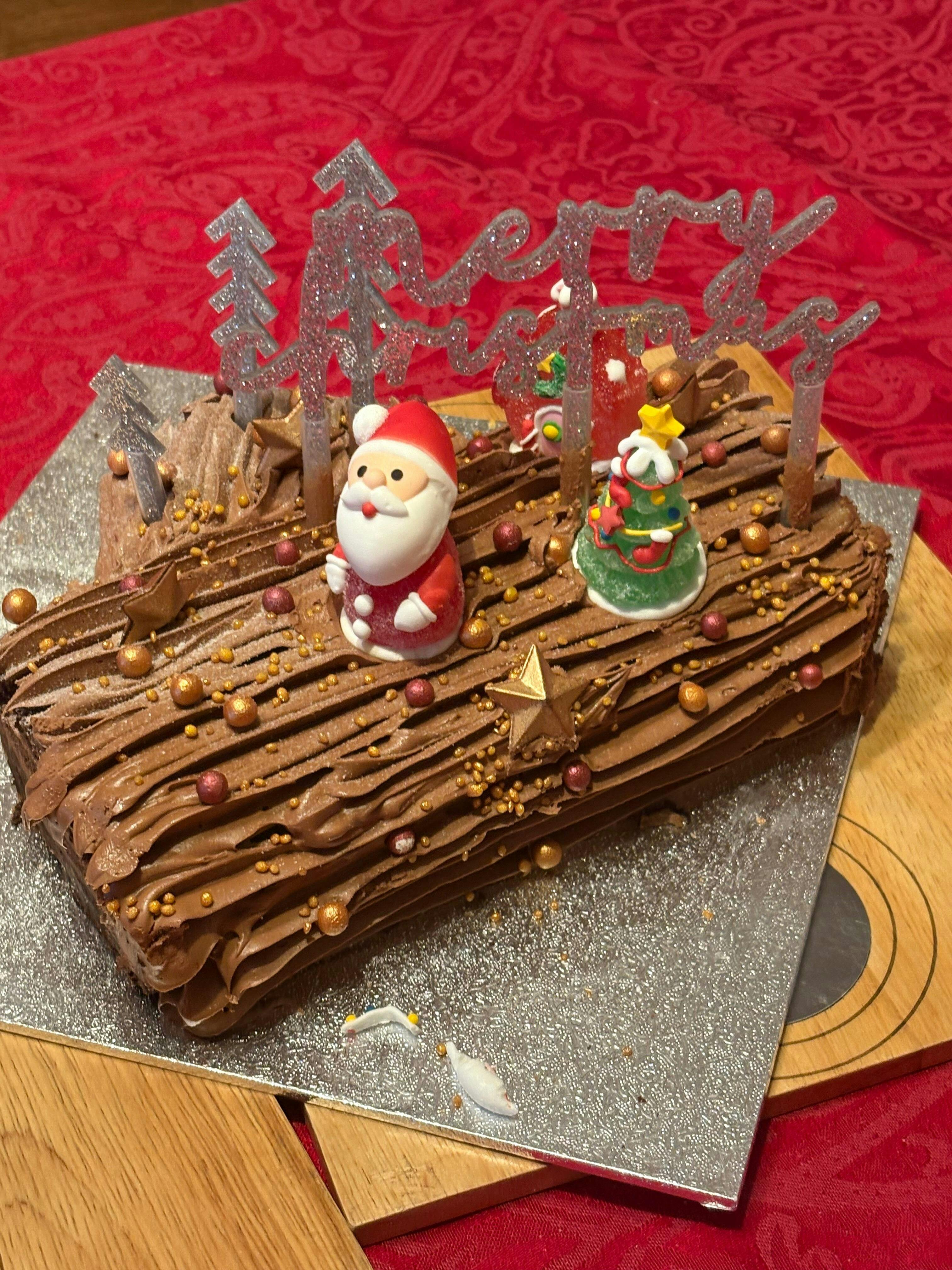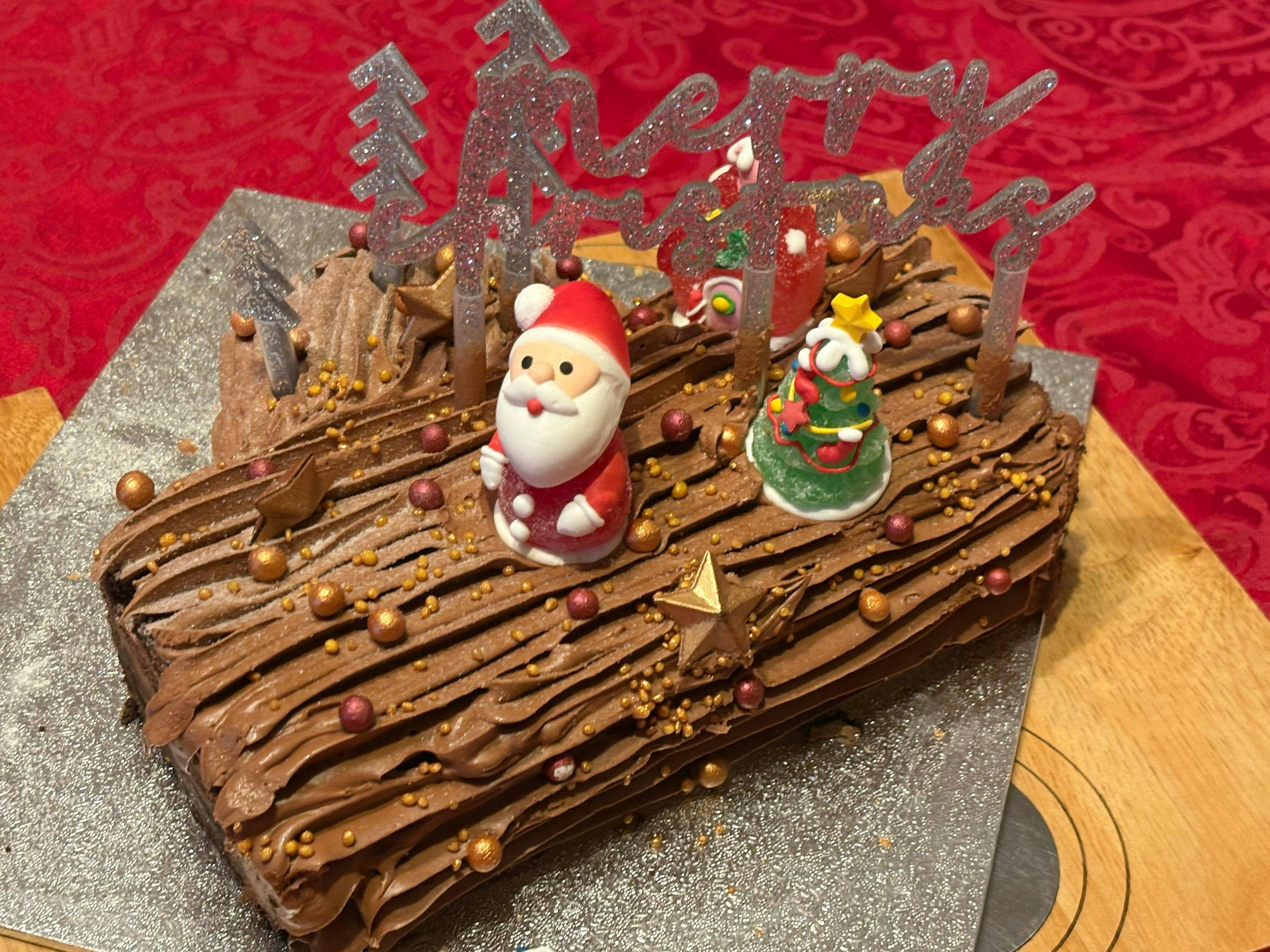 Chocolate Genoese Sponge Mix (Sugar, Wheat Flour (with Calcium, Iron, Niacin, Thiamin), Fat Reduced Cocoa Powder, Dried Egg White, Vegetable Oil, Dried Egg Yolk, Modified Starch (E1422), Whey (Milk) Powder (Milk), Emulsifiers: Propane 1, 2 Diol Esters Of Fatty Acids (E477), Mono And Diglycerides Of Fatty Acids (E471), Sodium Stearoyl 2 Lactylate (E481), Raising Agents: Potassium Bicarbonate (E501(ii)), Disodium Diphosphate (E450(i)), Calcium Acid Pyrophosphate (E450(vii)), Monocalcium Phosphate (E341(i)), Stabiliser: Hydroxypropyl Methyl Cellulose (E464), Wheat Gluten), Water, Cake Margarine (Vegetable And Hydrogenated Vegetable Oil, Water, Salt, Emulsifier (E475), Flavourings, Colours (E160b, E100))), Release Agent (Water, Vegetable Oil, Emulsifier (E476), Thickener (E903))), Chocolate Swiss Buttercream ([Dark Chocolate (33.3%) (Cocoa Mass, Sugar, Cocoa Butter, Emulsifier Soya Lecithin, Natural Extract Of Vanilla, Sugar, Butter (Milk), Free Range Pasteurised Egg White, Cake Margarine (Vegetable And Hydrogenated Vegetable Oil, Water, Salt, Emulsifier (E475), Flavourings, Colours (E160b, E100)), Vanilla Mauritius (Flavouring (Water, (E1520), Caramel Sugar Syrup, Thickener (E415), Acidity Regulator (Citric Acid), Preservative (E202), Glycerol (E442))), Star (Cocoa Mass, Sugar, Cocoa Butter, Vegetable Fat: Palm (SG), Emulsifier E476, E322 Soya, Natural Vanilla Flavour, Colour E172), Mini Crispy Shiny Rose Gold (Sugar, Milk Chocolate (Sugar, Whole Milk Powder, Cocoa Butter, Cocoa Mass, Emulsifier; Soya Lecithin Natural Vanilla Flavouring, Cocoa Solids) Crispy Cereal Centre (Rice Flour, Wheat Flour, Sugar, Malted Wheat Flour, Wheat Gluten, Salt), Stabilisers; Arabic Gum, Sucrose Esters Of Fatty Acids, E460, E464. Cocoa Butter, Colour; E172. Emulsifier; E472α (Contains Soya) Glazing Agent; Carnauba Wax), Mini Crispy Shiny Bordeaux (Sugar, Milk Chocolate (Sugar, Whole Milk Powder, Cocoa Butter, Cocoa Mass, Emulsifier; Soya Lecithin, Natural Vanilla Flavouring, Cocoa Solids), Crispy Cereal Centre (Rice Flour, Wheat Flour, Sugar, Malted Wheat Flour, Wheat Gluten, Salt), Stabilisers; Arabic Gum, Sucrose Esters Of Fatty Acids, E460, E464. Cocoa Butter, Colours; E172. Emulsifier; E472α (Contains Soya) Glazing Agent; Carnauba Wax) Golden Crunch Nuggets (Sugar, Rice Flour, Colour (E172 (Iron Oxides), E100 (Circumin)), Glazing Agent (E414 (Gum Arabic)), Sweet Snow (Dextrose, Cornflour, Fully Hydrogenated Vegetable Fat (Palm), Flavouring Natural), Christmas Jelly Figurines (Sugar, Glucose Syrup (30%), Corn Starch, Food Gelatine (Pork) (1,1%), Thickener: E407, Acidifiers: E330, E331, Colours: E100, E120, E129, E133, E153, Flavour).